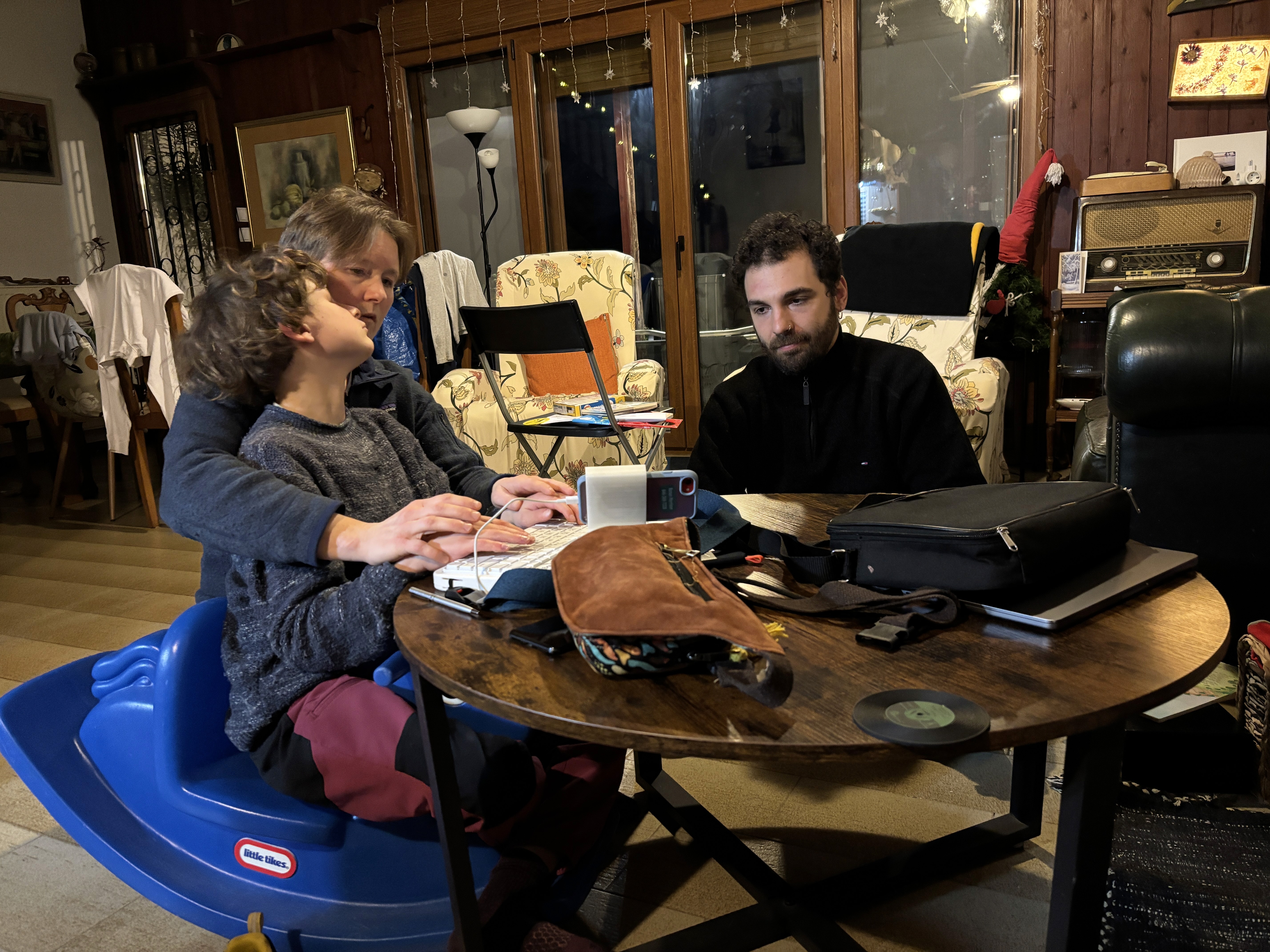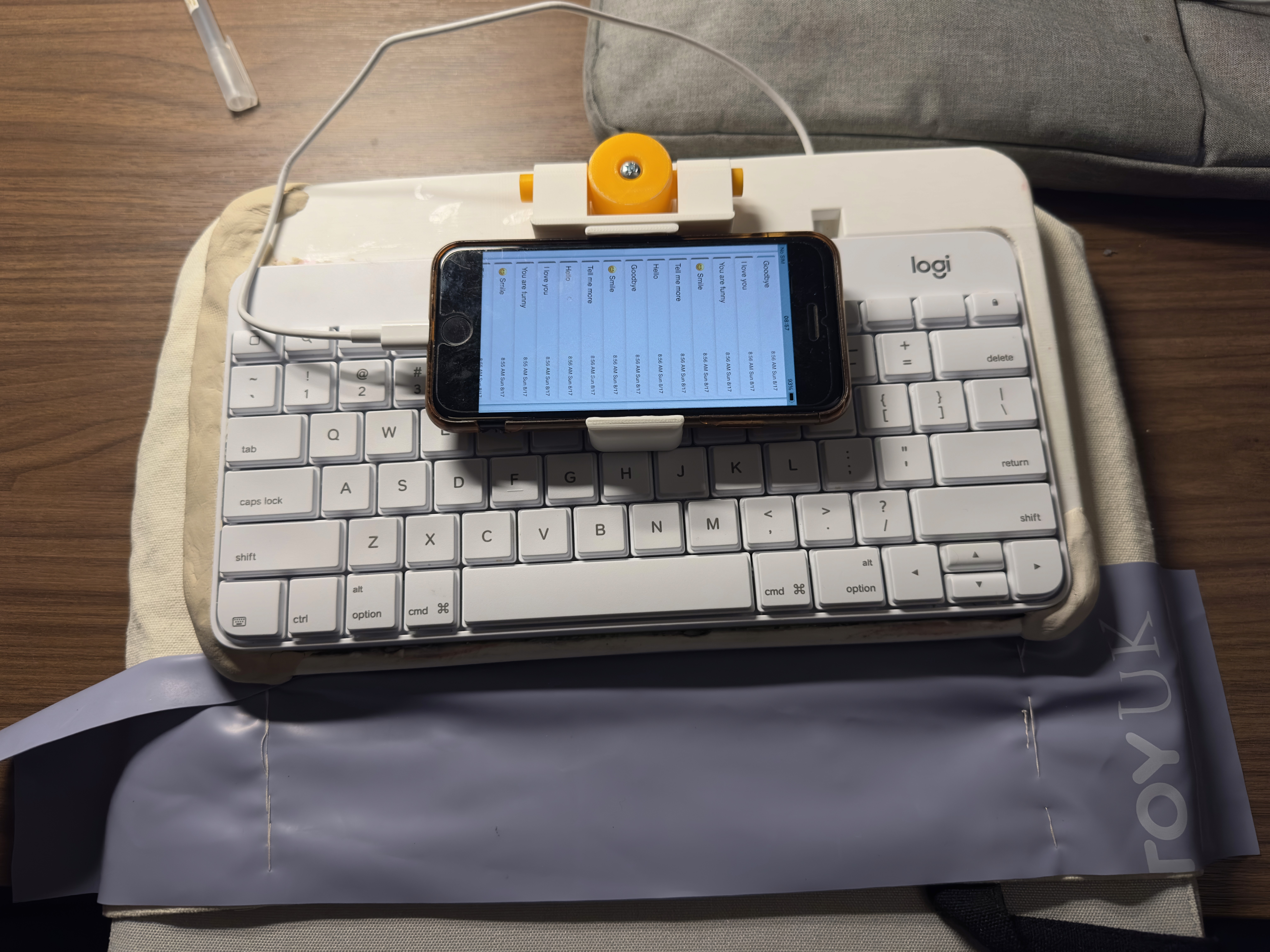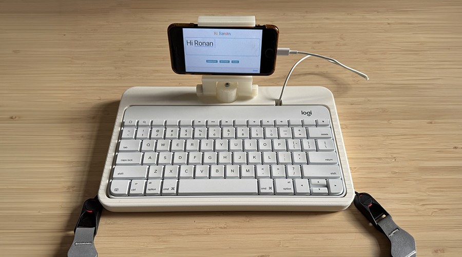 The prototype integrates Ronan's preferred keyboard with his smartphone into a single portable unit, powered by a locally hosted communication system designed specifically for him.