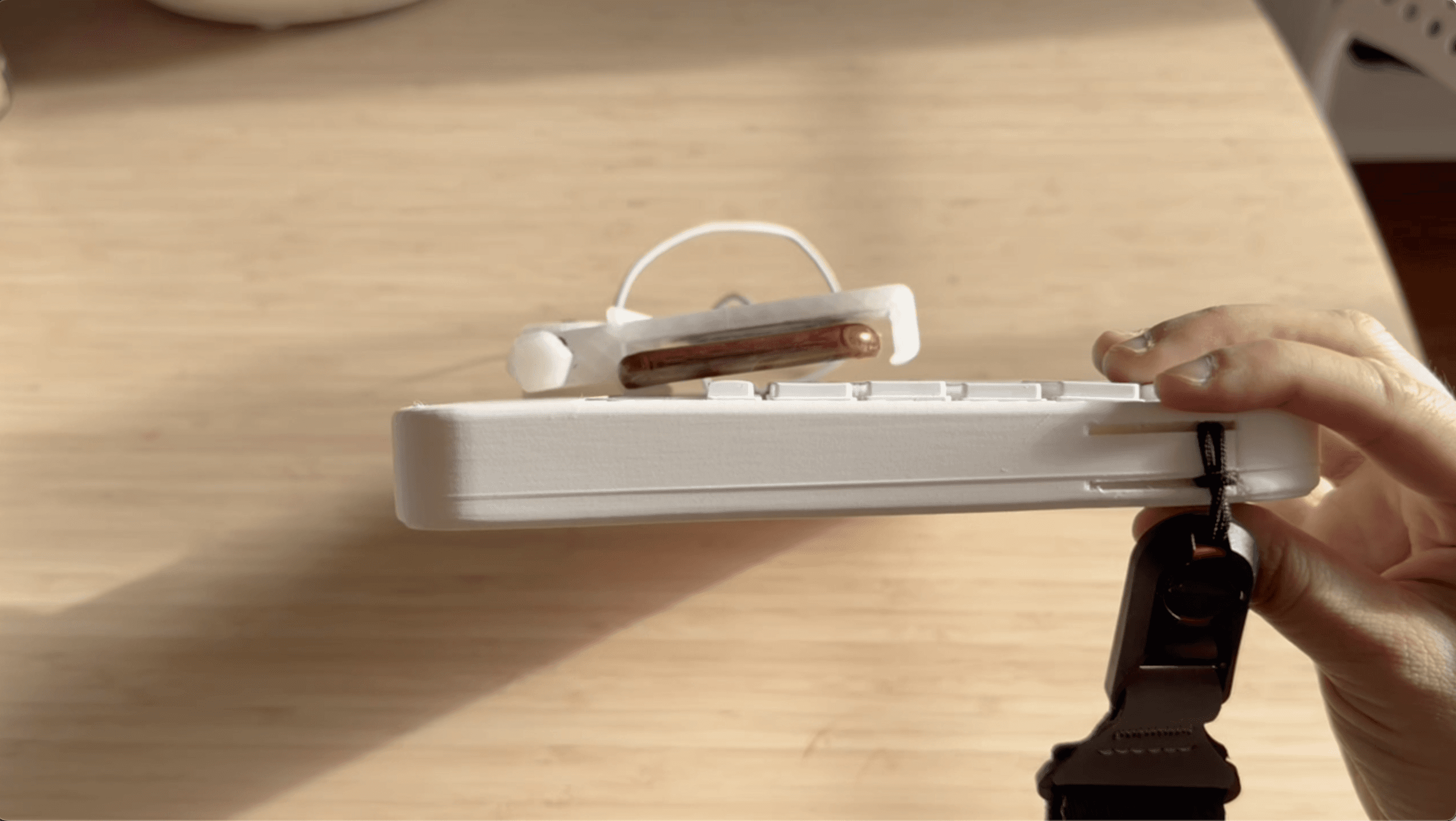 Portability vs. Comfort The cushioned base worked indoors, but was too bulky outside — so it was removed. A phone's weight also made it more practical than an iPad for Ronan to carry independently.